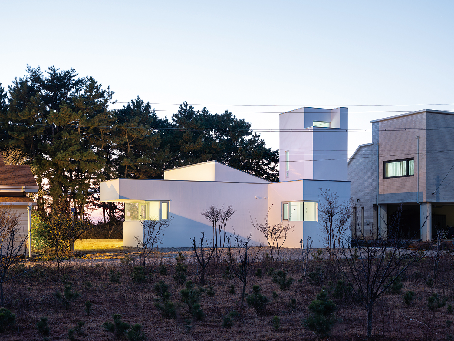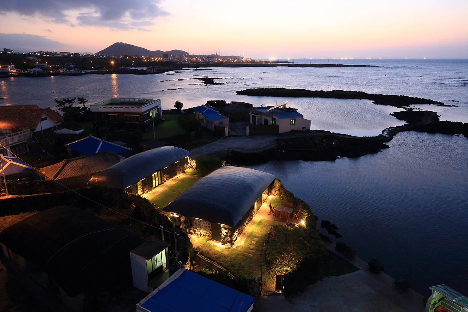 ์ง๋ถ ๋๋จธ์ ์๋๋ฌด์ ๋ฐ๋ค๊ฐ ๊ฑด๋ฌผ์ ๊ฐ๋ฆฌ์ง ์๊ณ , ์ง๋ถ๊ณผ ๊ฒน์ณ์ ธ ํ๋์ ํ๊ฒฝ์ผ๋ก ๋ณด์ธ๋ค. ์คํ
