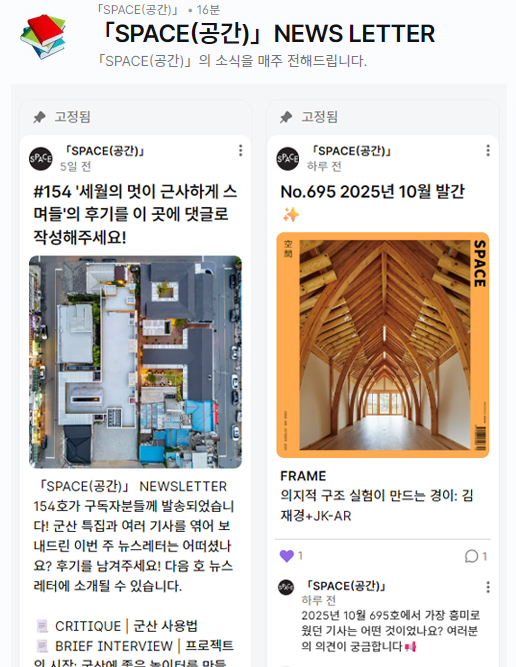 뉴스레터에서 소개된 컨텐츠와 월간「SPACE(공간)」의 이야기에 대해 자유롭게 이야기를 나눌 수있는 공간을 준비했습니다! 좋았던 점, 떠오른 생각, 다음 호에서 보고싶은 컨텐츠, 혹은 아쉬웠던 점까지 자유롭게 남겨주세요. 남겨주신 의견 중 일부는 다음 뉴스레터에서 공유하려고 해요. 짧은 한 줄도 큰 힘이 됩니다 🙂 여러분의 목소리를 기다립니다!