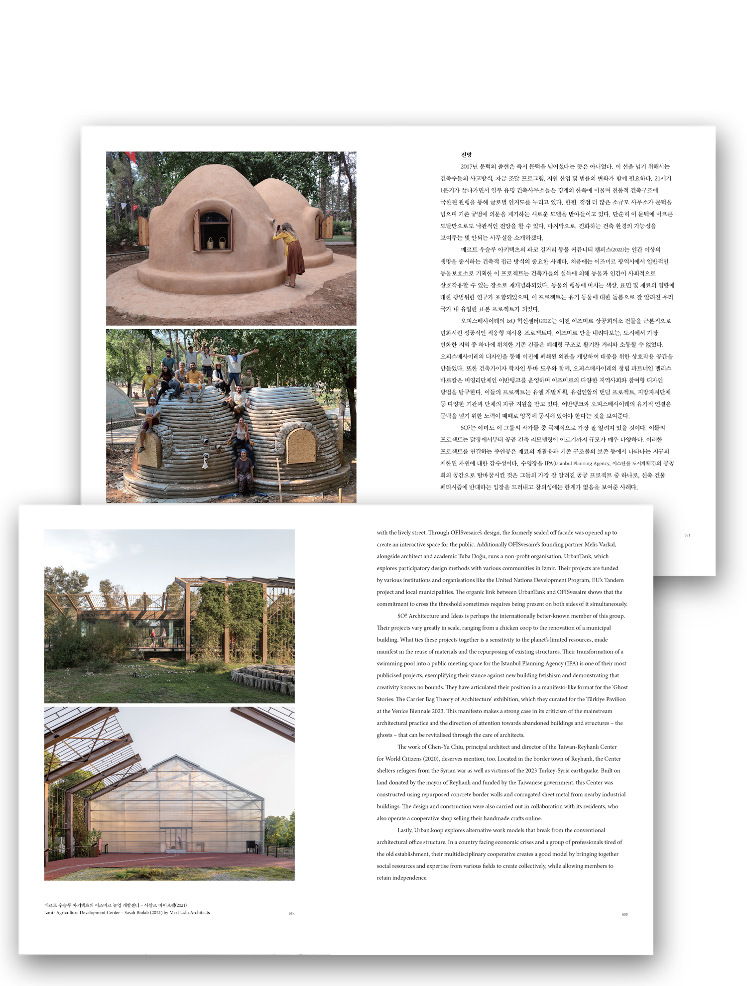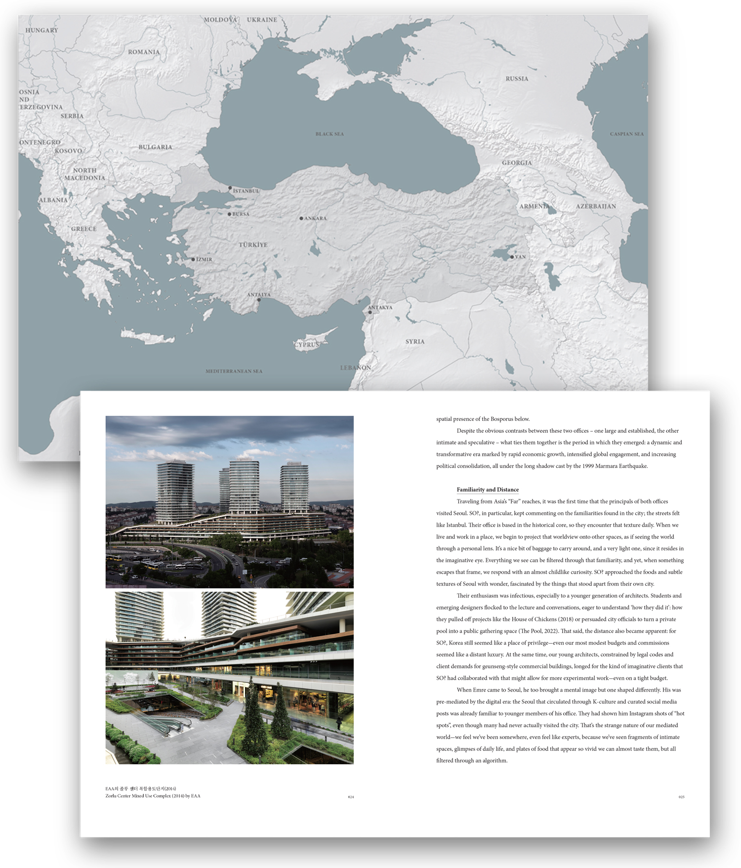 "두 사무소는 규모와 운영 방식 면에서 확연히 다르지만 하나의 공통점이 있다. 그들이 등장한 시대다. 1999년 마르마라 지진 이후 튀르키예의 어두운 현실 속에서 급속한 경제성장과 세계화, 정치체제의 변화로 대표되는 급변기를 함께 거쳐온 동시대의 존재라는 점이 유사하다. 근동에서나 극동에서나, 건축물을 엮어내는 이야기들은 기술적, 문화적, 심지어 감정적으로 이어져 있다." |